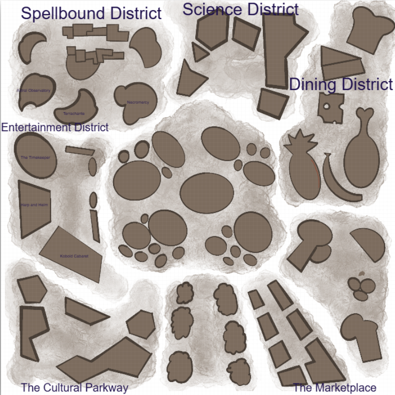 The Spellbound District, The Marketplace, The Cultural Parkway, The Entertainment District , The Science District, The Technology District and The Dining District.